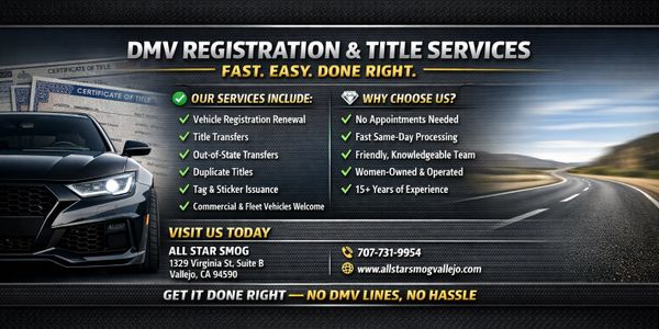 ALL STAR SMOG is accredited by the Bureau of Automotive Repair (BAR) and is authorized to perform smog checks and issue certificates. Partnered with the DMV as a third party to register vehicles and issue title transfers. Our accreditation ensures that we meet the highest standards of quality and comply with all state regulations.